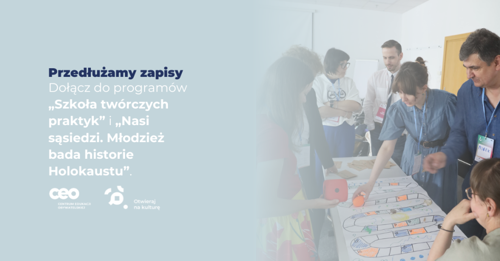 W tym roku możecie dołączyć do naszych dwóch programów edukacyjnych: „Szkoły twórczych praktyk” oraz „Nasi sąsiedzi. Młodzież bada historie Holokaustu”. Udział w programach wspiera realizację priorytetów Ministerstwa Edukacji i Nauki...